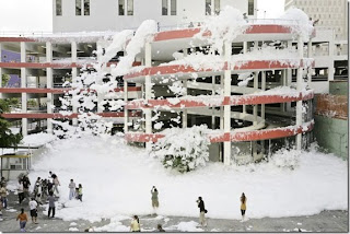 The “Foam City” was created across several blocks of Miami using the world’s biggest foam machine, capable of producing 2 million litres a minute. Streets, shops, car parks, trucks and people were all covered. The seven-day shoot involved a crew of 150… and an estimated 460 million litres of foam. Some 200 locals used Sony Cyber-shot digital stills cameras, Handycam camcorders and α digital SLR cameras and their images were uploaded onto an online database.Streets, shops, car parks, trucks and people were all covered. All photos on this page are taken from the official Sony site. There are lots more here.